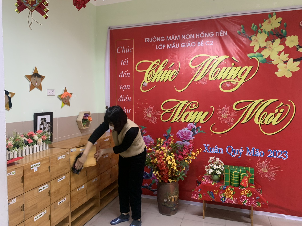 Sau thời gian nghỉ tết nguyên đán Quý Mão năm 2023, cùng với các trường, trường mầm non Hồng Tiến đã chuẩn bị sẵn sàng để đón các bé yêu trở lại trường. Để việc đón các bé được chu đáo, cẩn thận, chiều ngày 27/01/2023 (tức ngày mùng 5 tết), tập thể cán bộ, giáo viên, nhân viên nhà trường đã đến thực hiện công tác vệ sinh lại đồ dùng, lớp học, thông thoáng phòng lớp và chuẩn bị cho các hoạt động đón trẻ trở lại trường vào ngày đi học đầu tiên của năm 2023.