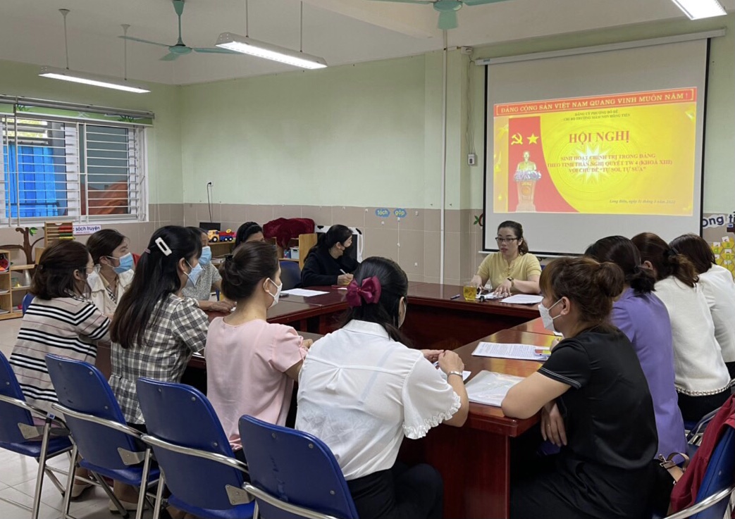 Tại hội nghị, đồng chí Lưu Thị Ngọc Diệp - Bí thư chi bộ - Hiệu trưởng nhà trường đã quán triệt mục đích, yêu cầu của hội nghị nhằm tạo sự chuyển biến sâu sắc về nhận thức, hành động của cấp ủy, tổ chức Đảng, cán bộ, đảng viên trong thực hiện Kết luận, Quy định của Hội nghị Trung ương 4 (Khóa XIII), gắn với việc “Học tập và làm theo tư tưởng, đạo đức, phong cách Hồ Chí Minh”, góp phần xây dựng, chỉnh đốn Đảng và hệ thống chính trị trong sạch, vững mạnh; nâng cao chất lượng đội ngũ cán bộ, đảng viên. Kịp thời nắm bắt tư tưởng; phát hiện, ngăn chặn, đẩy lùi tình trạng suy thoái về tư tưởng chính trị, đạo đức, lối sống, biểu hiện “Tự diễn biến”, “tự chuyển hóa” trong nội bộ Đảng.